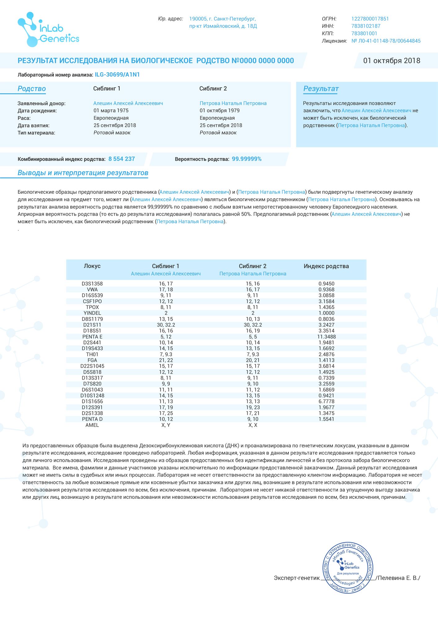 Точность этого ДНК теста высочайшая и достигает 100%. Лаборатория проводит параллельно два теста разными группами специалистов для независимого контроля информации. Затем результаты заверяются подписью заведующего лабораторией и печатью.