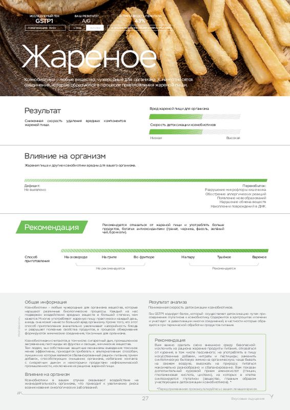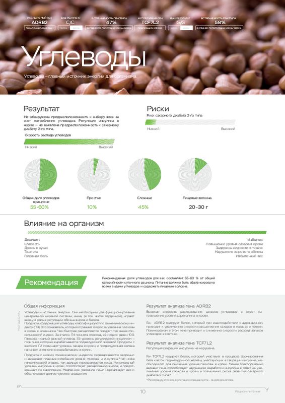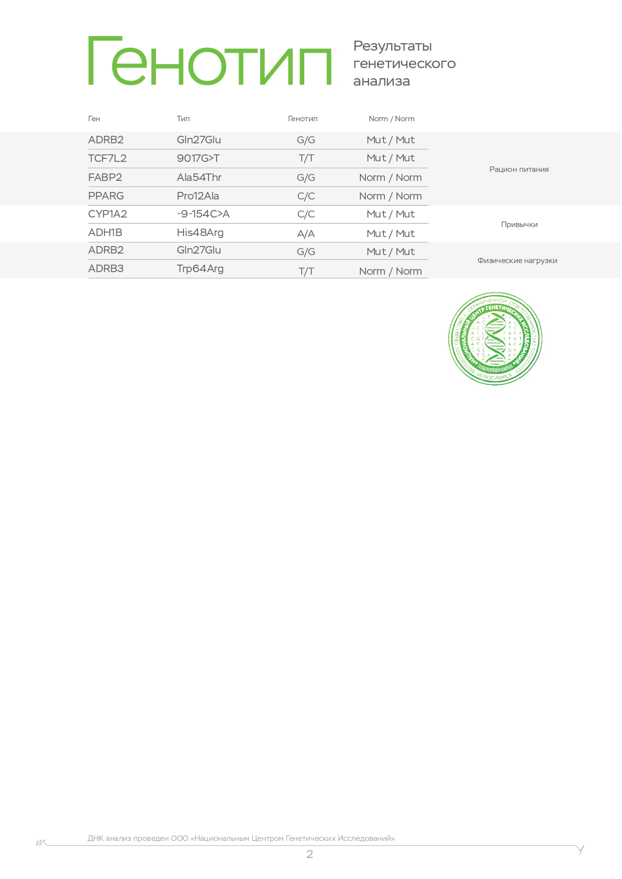 Этот ДНК анализ показывает, к каким физическим нагрузкам человек расположен генетически, а также какие продукты (содержащие определенные элементы) лучше употреблять в пищу. У каждого человека свои цели, кто-то хочет просто сбросить лишний вес, кто-то увеличить силу мышц, а кто-то нарастить огромные мускулы. Для получения максимальной отдачи от тренировок мы рекомендуем пройти наш генетический тест для фитнеса в Кинешме.