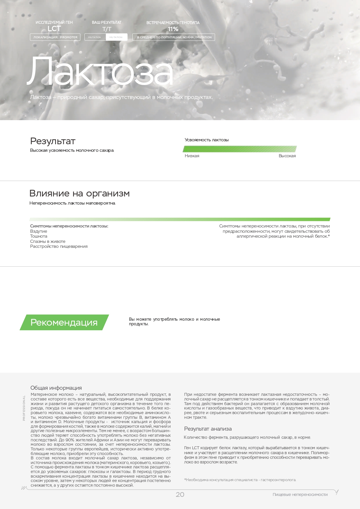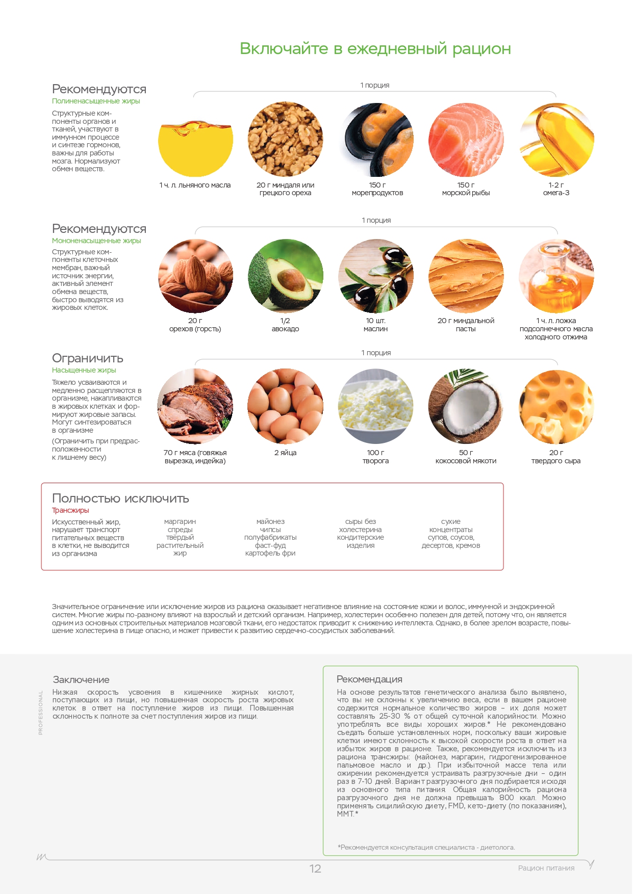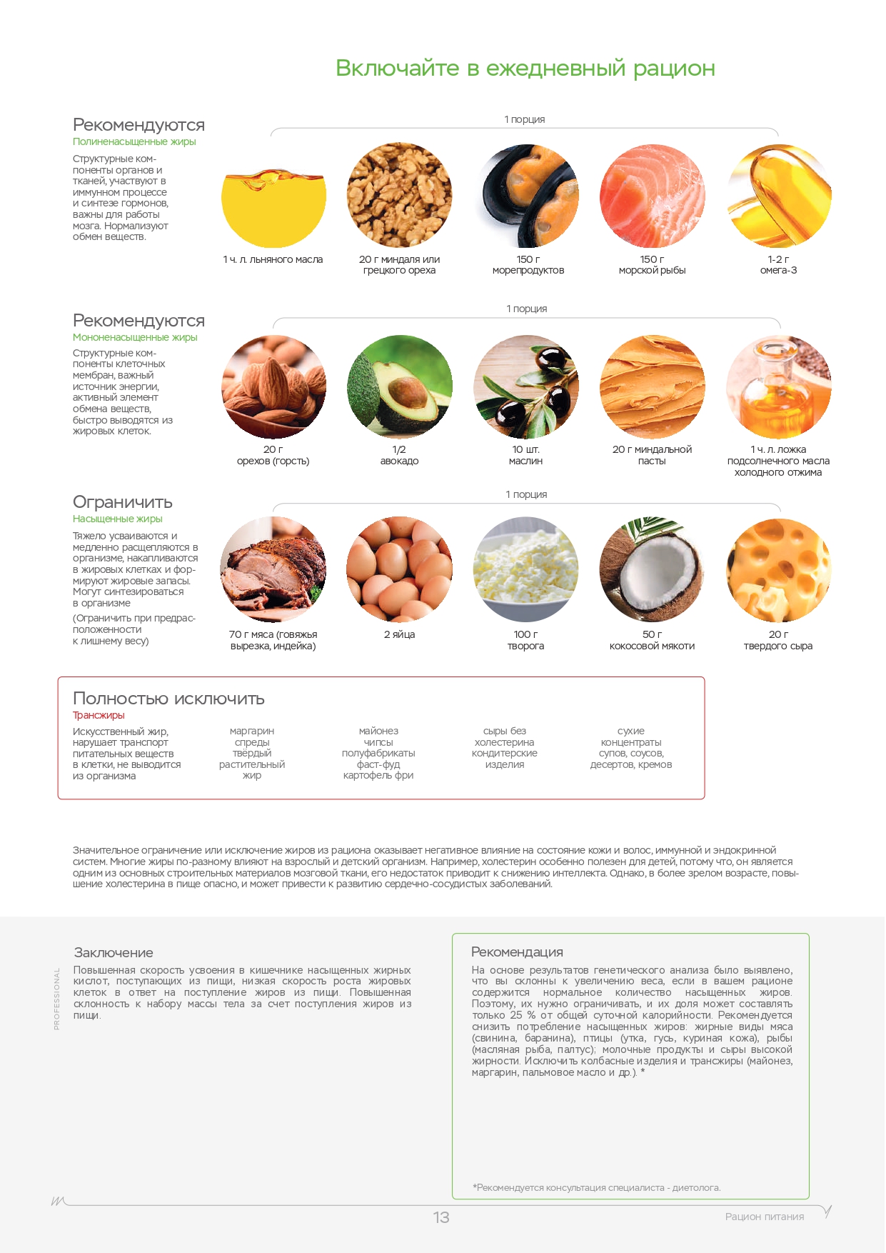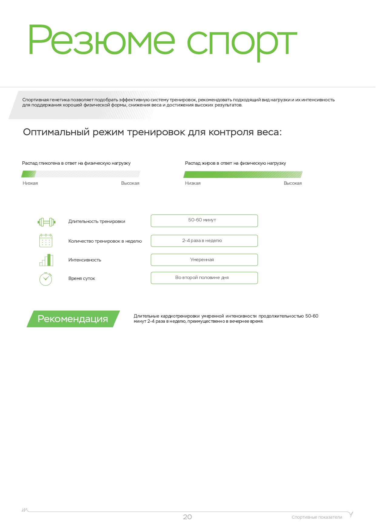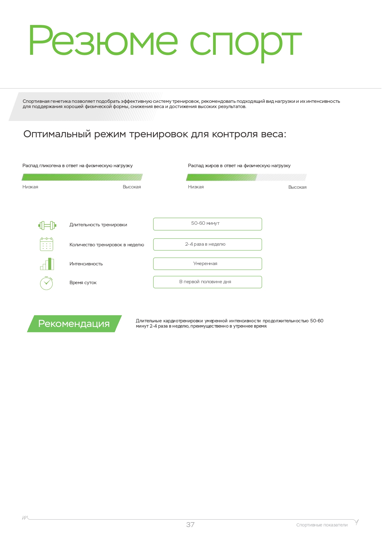 Помните, что помимо физических нагрузок большую роль играет питание. Вы также можете пройти ДНК-тест на диету, который покажет, каких веществ не хватает в организме, какие организм усваивает лучше, а какие хуже и многое другое.