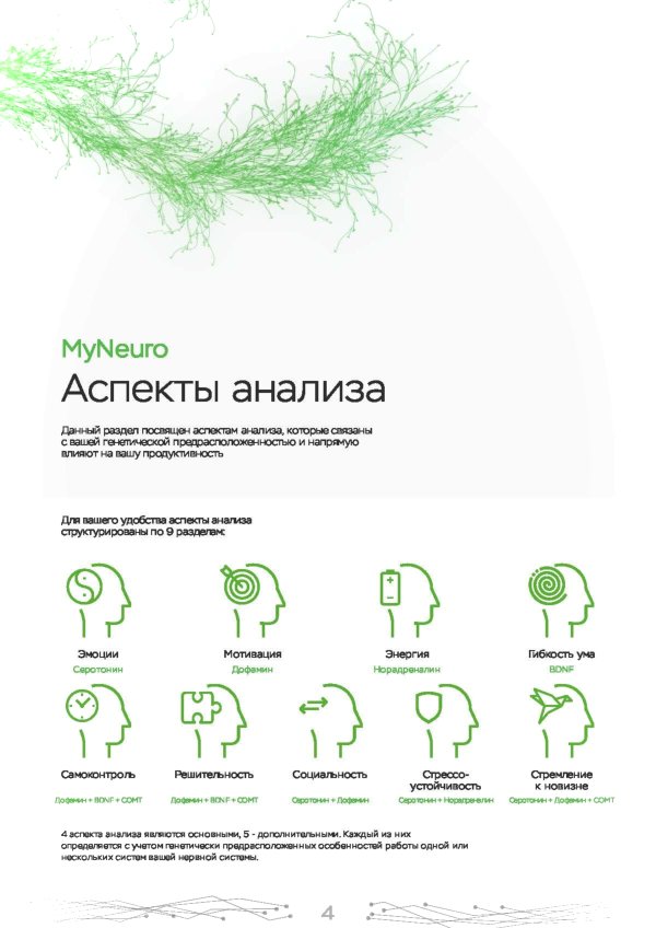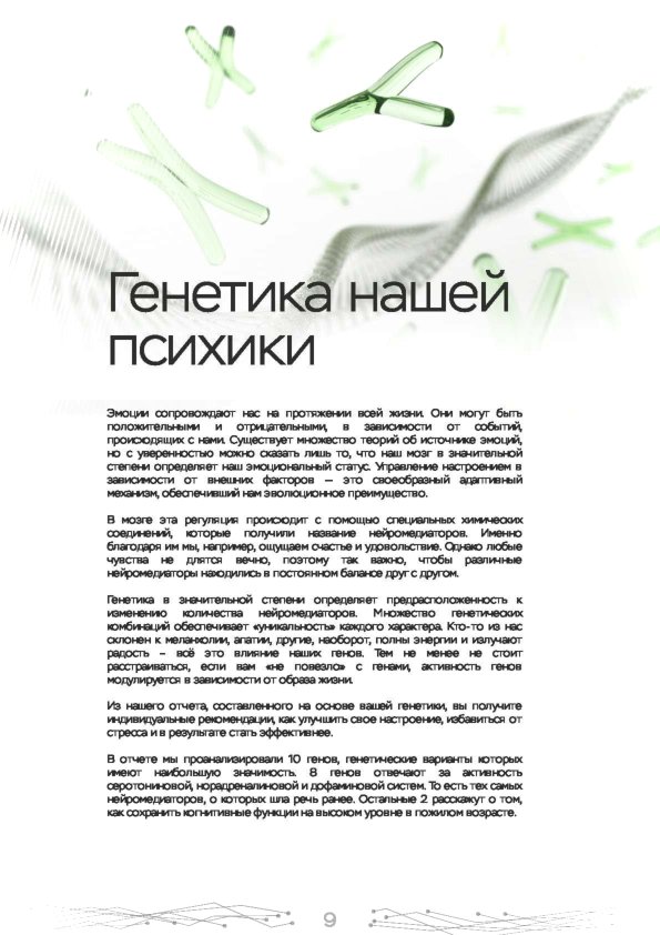 Эмоции и психические состояния регулируются нейромедиаторами — особыми химическими соединениями, они регулируют передачу электрохимического импульса между нейронами, а также между мозгом и мышцами. Интенсивность работы нейромедиаторов определяется генами. Проанализировав определенные гены можно повысить эффективность работы, самочувствие и снизить уровень стресса.