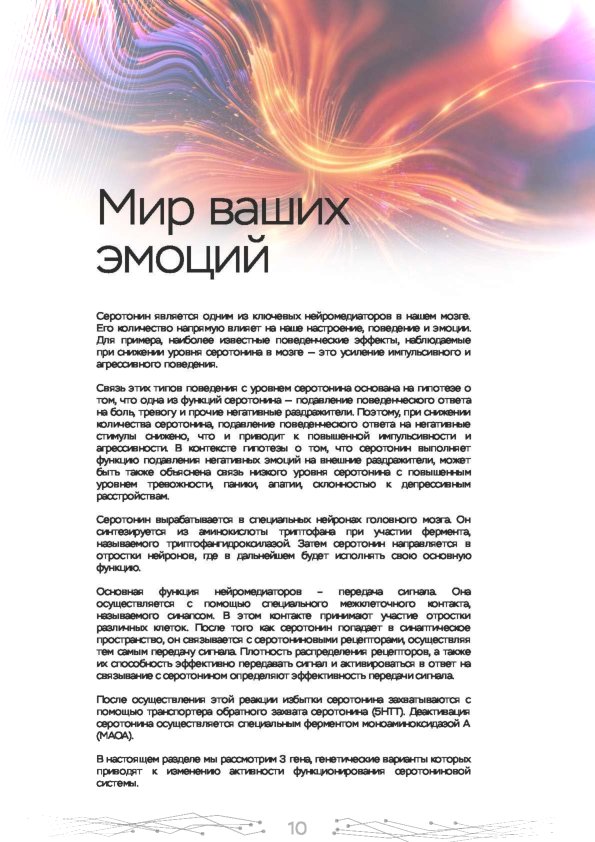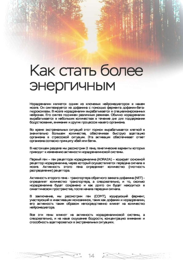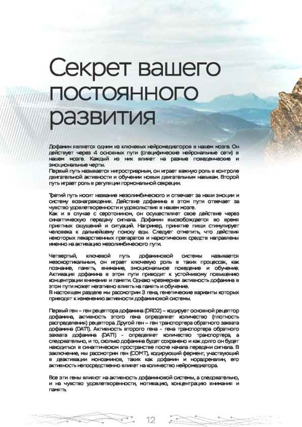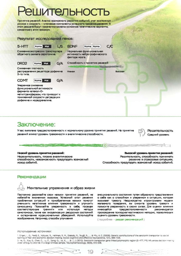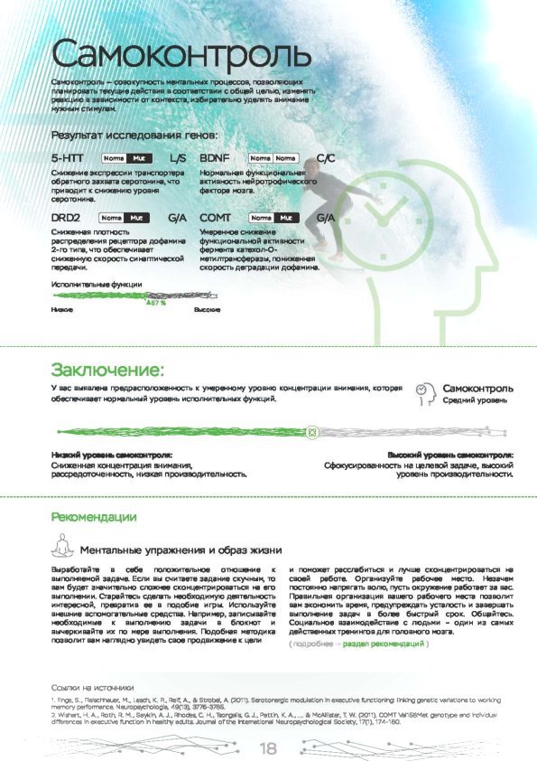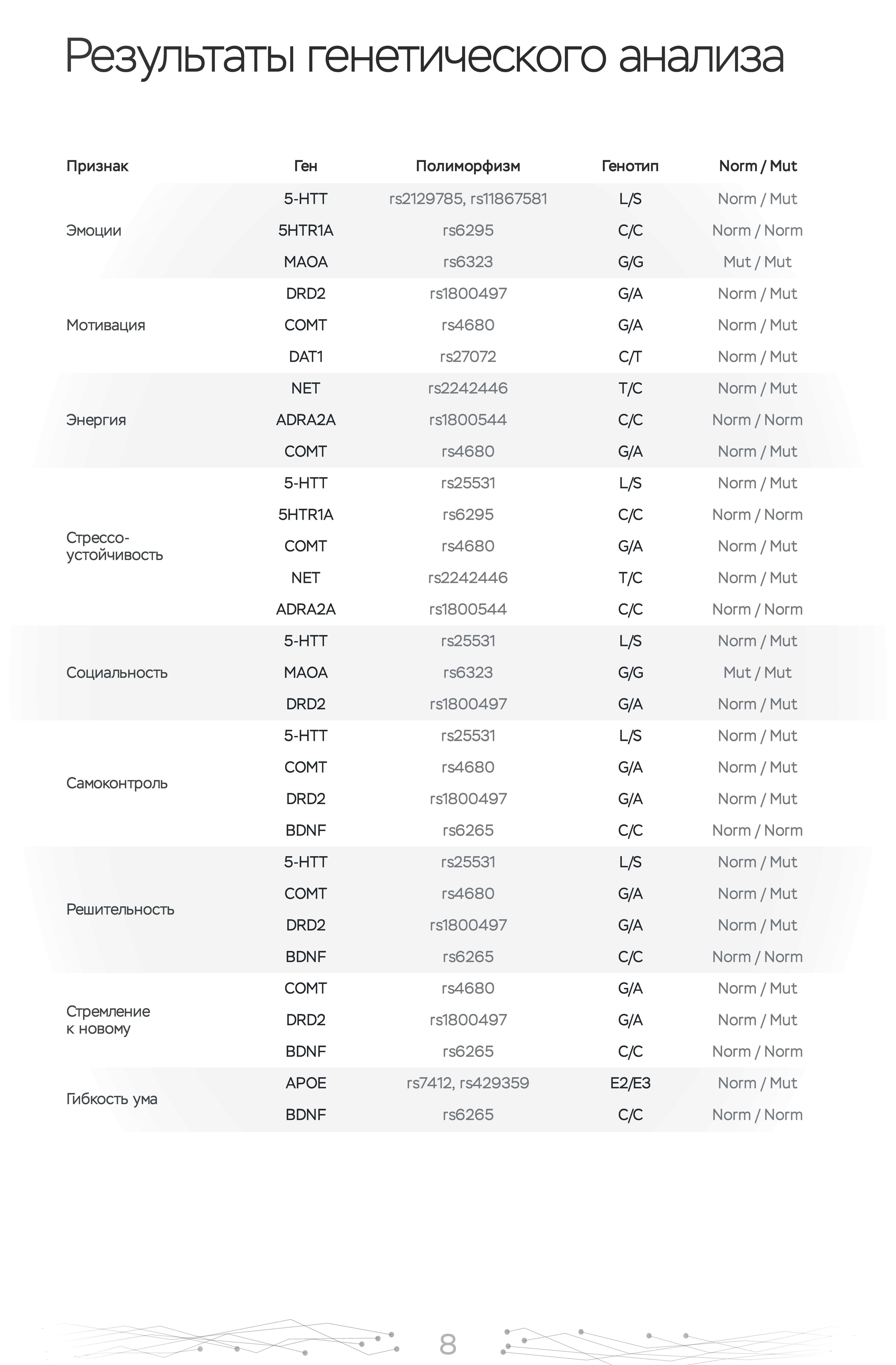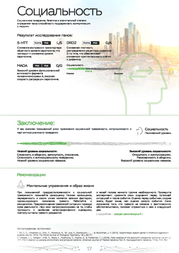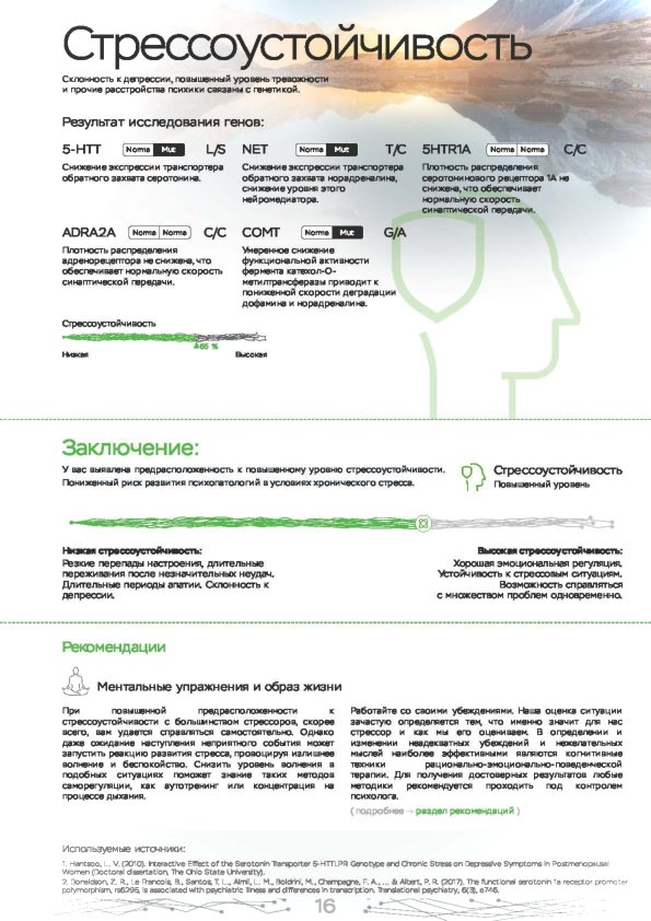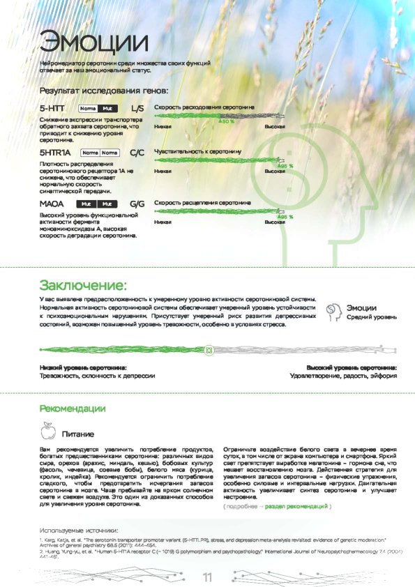 Этот ДНК анализ показывает влияние наиболее важных 10 генов на психическое и эмоциональное состояние. Именно они регулируют выработку гормонов, работу нейромедиаторов. Используйте знания о природных свойствах своего организма для борьбы со стрессом, повышения работоспособности и общего тонуса. Каждый человек индивидуален, поэтому мы рекомендуем пройти наш генетический нейро тест в Кинешме.